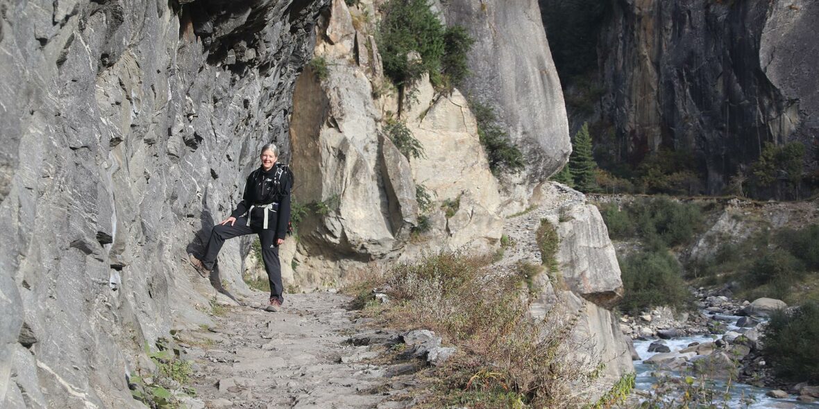 The route takes us through some beautiful woods and past several small shelters (caves) and a pilgrims’ ‘Dharmasala’. As we emerge out of a narrow canyon, the trail actually passes under a wide waterfall just before the Dharmasala, from which point the woods become thinner and the vistas wider. The last stretch into Meta takes us up a steep hill from where we get amazing views of some of the giant snowy peaks in the area. Meta lies on a big open plain and consists of a few lodges, which are simple but clean and offer you a good hearty meal.