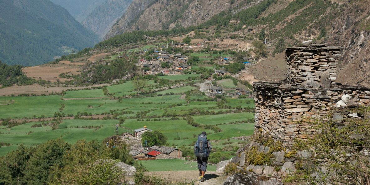 It’s a harder day than it looks on the map to reach Gompa Lungdang but worth the effort to get there for the experience of staying with the friendly nuns and the mountain panorama of the Ganesh Himal peaks surrounding the gompa. Leaving camp the same way we came, we backtrack down the large hill on the switchbacking trail that we climbed a few days previously. When we reach the shop and our friend’s small house at Gho we’ll take a sharp left turn and descend through ferms and dense folliage to the Shiar Khola which we cross on a small, wooden bridge. A short hike through light forest brings us to the green hamlet of Dumje (2450m) where some of the young nuns from Gompa Lungdang stay and study, and the nuns have their barley fields. From where we’ll have an often steep three hour hike far above the Laudang Khola to reach Gompa Lungdang. The views are great along the way and there are plenty of resting points en route. Note that the first time you’ll see Gompa Lungdang from the second vertical prayer flag pole on a ridge it’s still a good hour and a few hundred meters away.