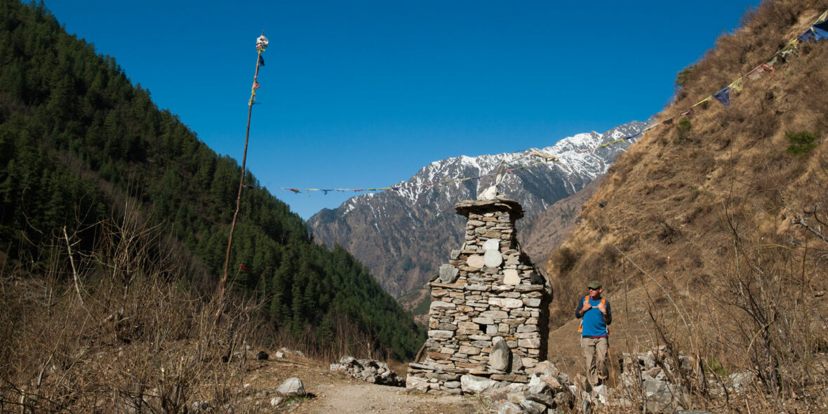 Back down the steep hillside is easier for some than the ascent and should take us an hour and a half to reach the small nunnery outpost at Dumje. We stay on the opposite side of the river than our route in, we hike briefly along a narrow trail between wooden fences which actually passes through a local inhabitant’s barn and then drop down to a new suspension bridge over the Laudang Khola. After crossing to the other side we’ll have about twenty minutes of flat hiking before reaching an ancient, lichen-covered chorten and mani wall marking what seems to be the far reaches of Dumje. We continue, climbing very gradually, though a dense forest which looks as if it might be home to snakes, bears and monkeys (although we never saw any).