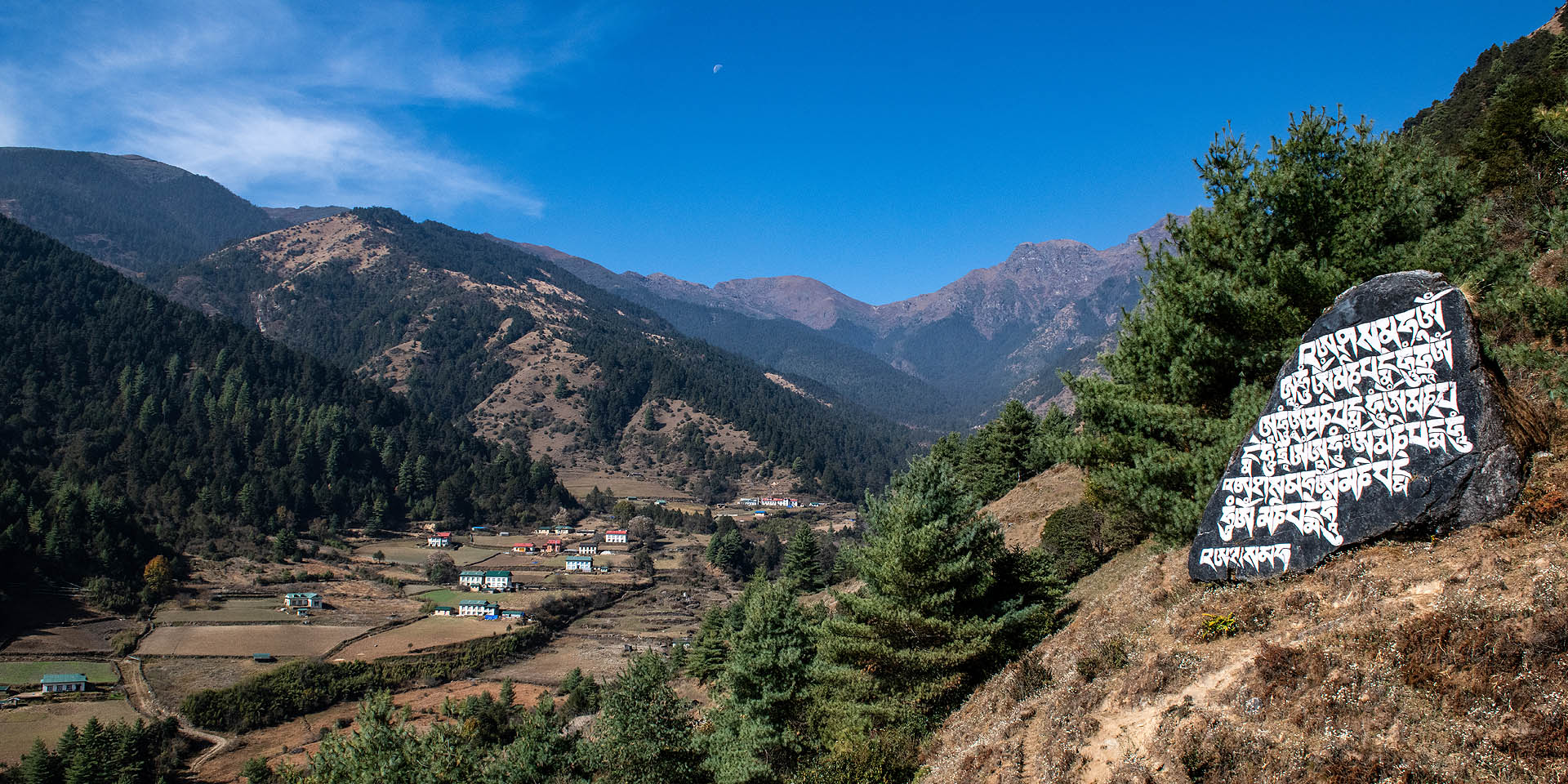 This morning we bid farewell to Junbesi and hit the trails again, bound for Taksindu. We cross the river at the ‘bottom’ of town and climb through forest up to Salung from where we get views of Mount Everest (8848m), Chamlang (7319m) and Makalu (8481m), weather permitting.